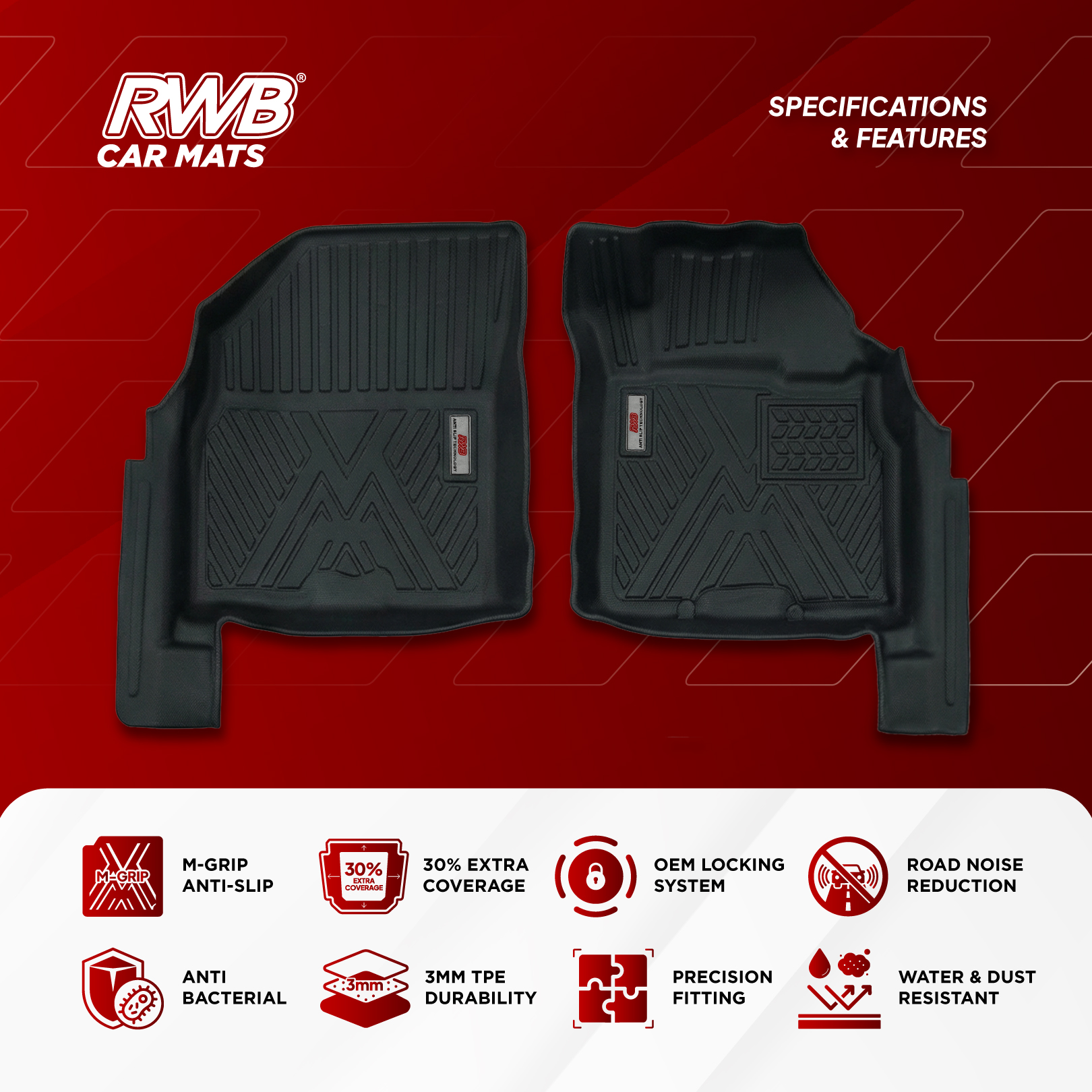 Struktur traksi berbentuk “M” menjaga karpet tetap stabil. Tidak bergeser saat berkendara maupun saat keluar masuk mobil.