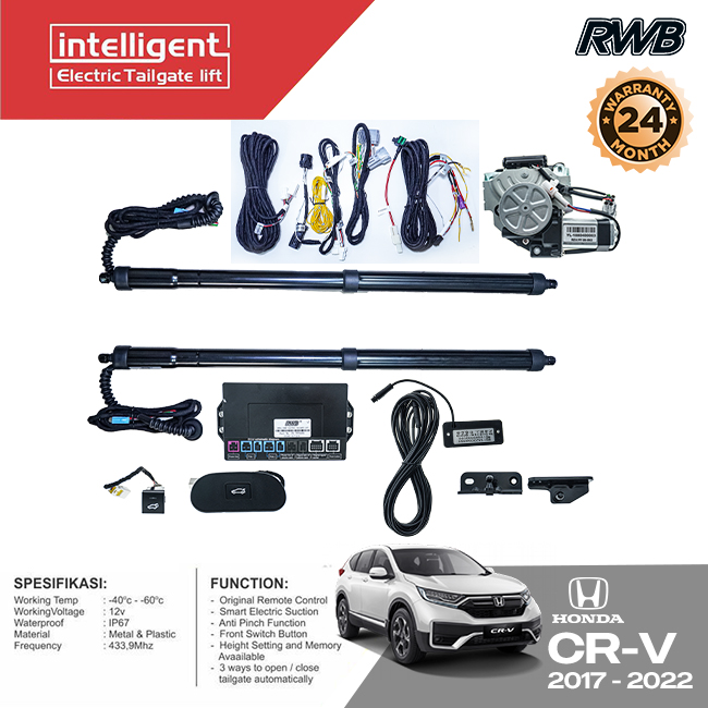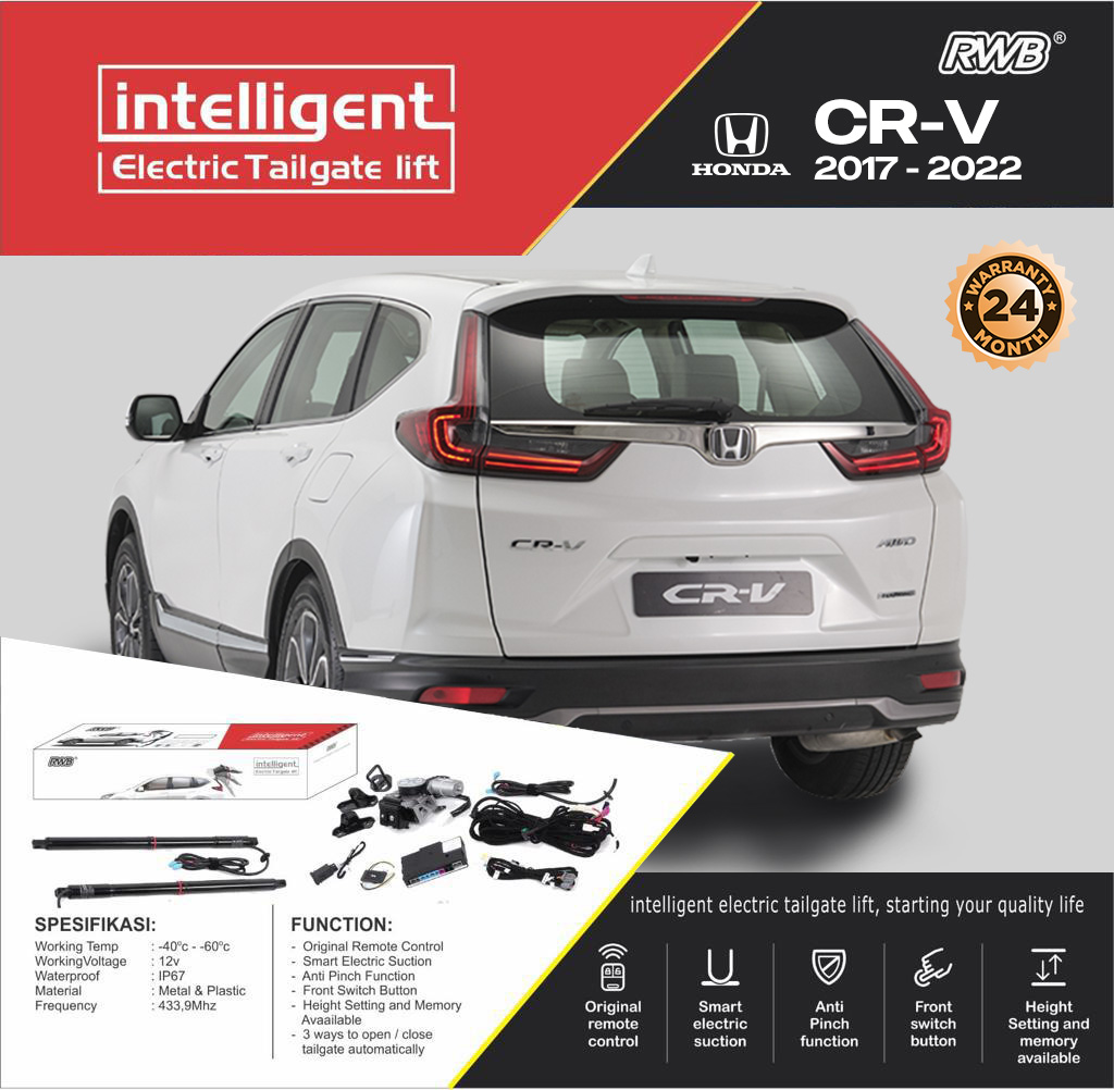 Power Back Door RWB dirancang khusus untuk Honda CR-V Turbo 2017-2022 dengan sistem Plug & Play sehingga pemasangan mudah tanpa modifikasi kabel bawaan mobil. Produk ini dilengkapi dengan sensor kaki dan fitur keamanan cerdas yang akan mendeteksi hambatan – pintu bagasi otomatis akan kembali terbuka jika ada benda atau tangan yang menghalangi saat proses penutupan berlangsung.
