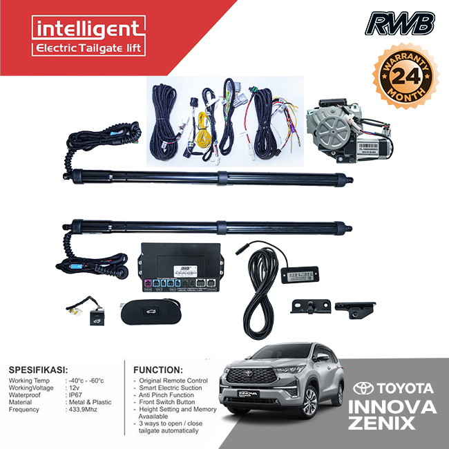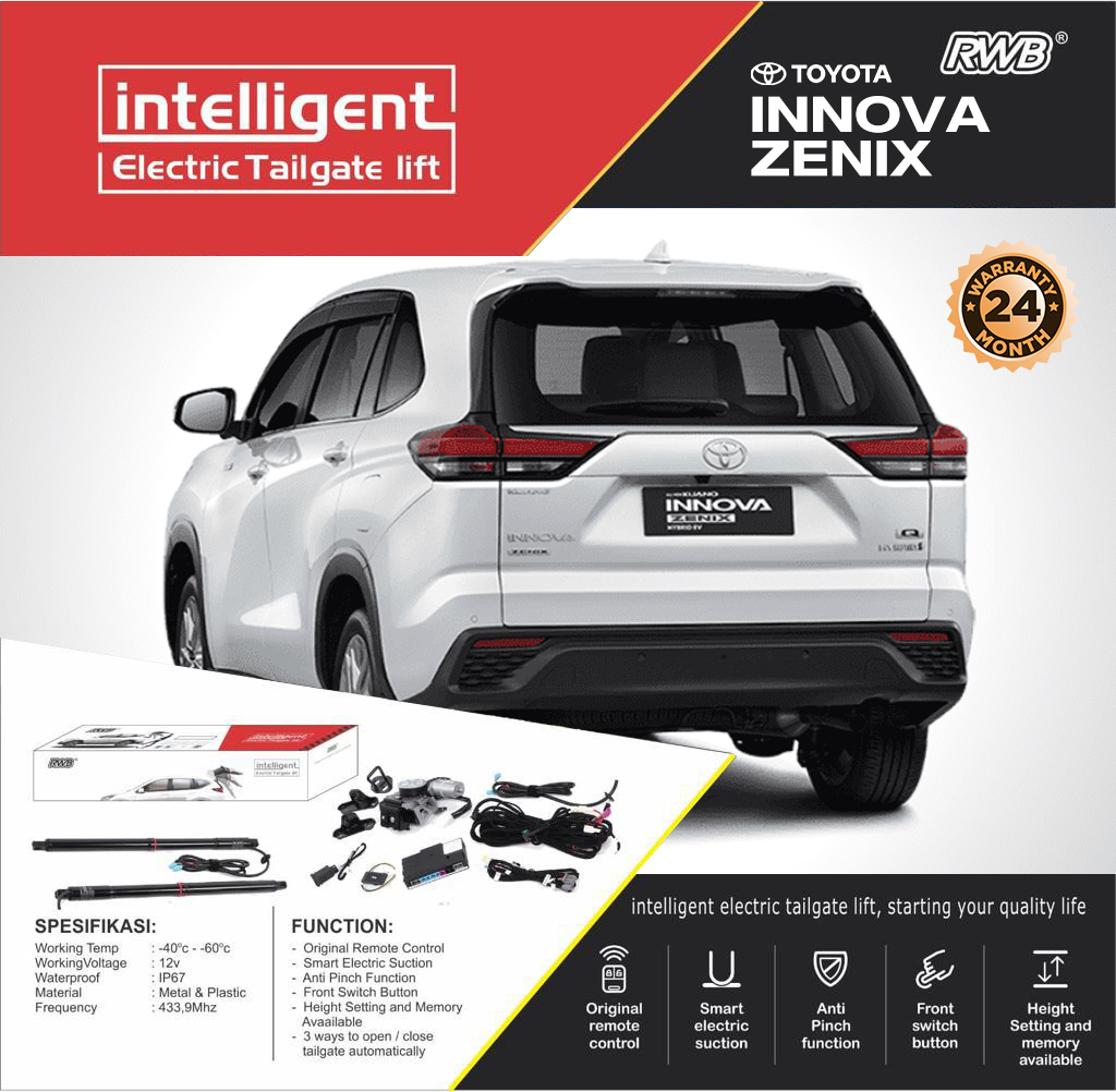 Power Back Door RWB dirancang khusus untuk Innova Zenix tipe G dan V dengan sistem Plug & Play sehingga pemasangan mudah tanpa modifikasi kabel bawaan mobil. Produk ini dilengkapi dengan sensor kaki dan fitur keamanan cerdas yang akan mendeteksi hambatan – pintu bagasi otomatis akan kembali terbuka jika ada benda atau tangan yang menghalangi saat proses penutupan berlangsung.