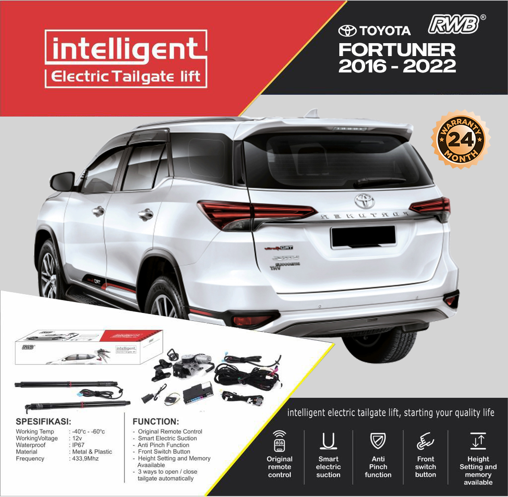 Power Back Door RWB dirancang khusus untuk Toyota Fortuner 2016-2025 dengan sistem Plug & Play sehingga pemasangan mudah tanpa modifikasi kabel bawaan mobil. Produk ini dilengkapi dengan sensor kaki dan fitur keamanan cerdas yang akan mendeteksi hambatan – pintu bagasi otomatis akan kembali terbuka jika ada benda atau tangan yang menghalangi saat proses penutupan berlangsung.